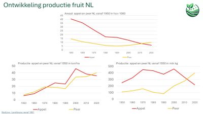 De oppervlakte appel- en peer is de afgelopen 75 jaar gedecimeerd. Tegelijkertijd is de productie per hectare verviervoudigd waardoor de totale Nederlandse productie zelfs nog iets is gestegen.