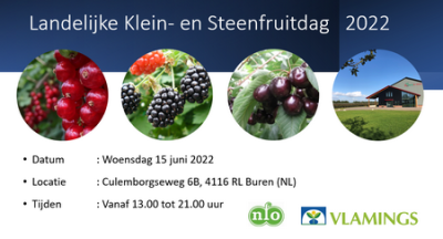 Op woensdag 15 juni organiseren de NFO en Vlamings de landelijke klein- en steenfruitdag. De dag begint om 13:00 uur en eindigt om 21:00 uur en is bij BerryBrothers en MegaKers in Buren.