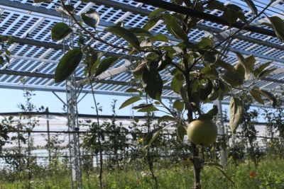In Duitsland zijn op een biologische fruitbedrijf in Rheinland-Pfalz als proef zonnepanelen boven appelbomen geplaatst. Binnen het project ‘Agri-PV Fruitteelt’ wordt de mogelijkheid van gelijktijdige stroomopwekking en bescherming tegen weersinvloeden onderzocht.