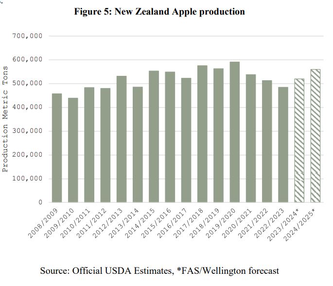 Sinds 2010 is de appelproductie in Nieuws-Zeeland licht gestegen maar in de afgelopen jaren zag je geen stijgende productie meer. Hierbij speelt de schade van een cycloon in 2023 in de belangrijkste teeltgebieden naar verwachting mee. Dit jaar ligt de verwachte productie van 560.000 ton appels weer duidelijk hoger. Het areaal appels ligt op circa 11.000 hectare. Naast appels teelt Nieuw-Zeeland ook peren, kersen en blauwe bessen maar daarvan liggen de exportvolumes laag.