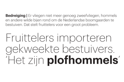 Dagblad Trouw zet in een artikel van liefst twee pagina’s over gekweekte bestuivers de fruittelers in een negatief daglicht. Fruittelers importeren gekweekte bestuivers en dat zorgt voor problemen. Deels is de inhoud van het verhaal hetzelfde hetzelfde als eerdere gepubliceerde berichten dat door klimaatsverandering, intensieve grootschalige landbouw en stikstofdepositie het aantal insecten en dus ook bestuivende insecten sterk afneemt en dat dit door gebrek aan bestuivers tot een kleinere en kwalitatief slechtere fruitoogst leidt.
