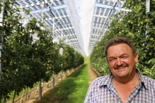De fruitteler plaatste op een stuk van 4.000 m2 zonnepanelen boven 9 jaar oude Gala Schniga-bomen. Hij is daarmee de eerste teler in Europa die zonnepanelen boven volwassen appelbomen heeft geplaatst.