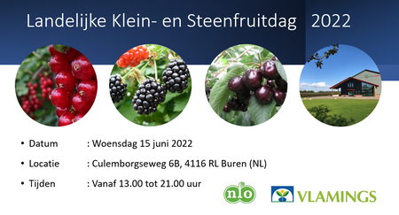 Op woensdag 15 juni organiseren de NFO en Vlamings de landelijke klein- en steenfruitdag. De dag begint om 13:00 uur en eindigt om 21:00 uur en is bij BerryBrothers en MegaKers in Buren. De open dag is bestemd voor professionele telers van houtig kleinfruit (rode bes, braam & framboos) én steenfruit (kers & pruim), Vanaf 14.00 tot 20.00 uur zijn er regelmatig rondgangen langs verschillende proeven en demonstraties. Ook is er een informatiemarkt met stands van toeleveringsbedrijven en fabrikanten.