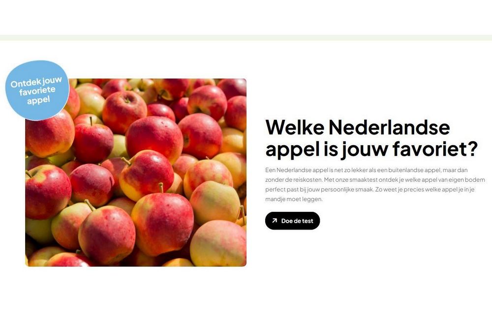 Na het invullen van en korte test krijgt de consument antwoord op de vraag: Welke Nederlandse appel is jouw favoriet? Volgens de website gaat het om appels ‘van eigen bodem’. Wat Granny Smith, Fuji, Gala, Yello, Jazz en Pink Lady daar dan tussen doen is een raadsel.