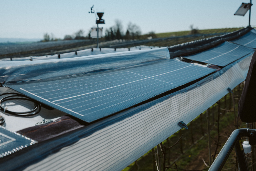 Op het fruitbedrijf van VOEN-eigenaar Reinhard Vöhringer in het dorpje Berg bij Ravensburg aan de Bodensee zijn als test twee rijen kersenbomen over een lengte van 40 meter voorzien van de nieuw ontwikkelde flexibele lichtgewicht zonnepanelen.