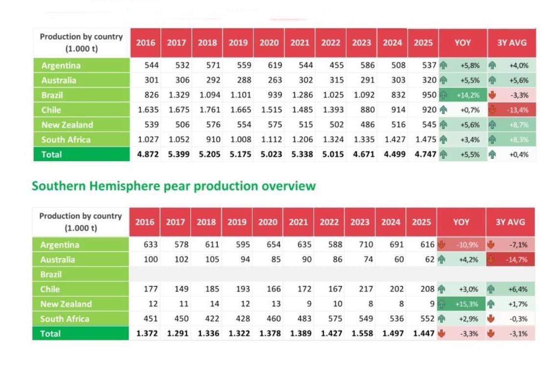 De belangrijkste productielanden op het zuidelijk halfrond verwachten dit seizoen 4.746.639 ton appels te plukken. Dit is 5,5% meer dan in 2024. Bij peren wordt een oogst van 1.446.970 ton verwacht. Dit is 3,3% minder dan vorig jaar. De oogstraming werd eind deze week bekend gemaakt door de World Apple and Pear Association (WAPA)